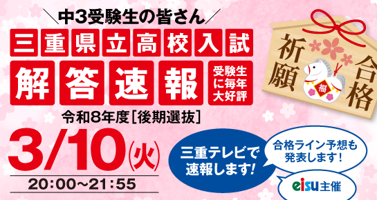 テレビ番組終了後には、「三重県立高校入試[後期選抜]解答速報」をeisuのWEBサイトに掲載します。