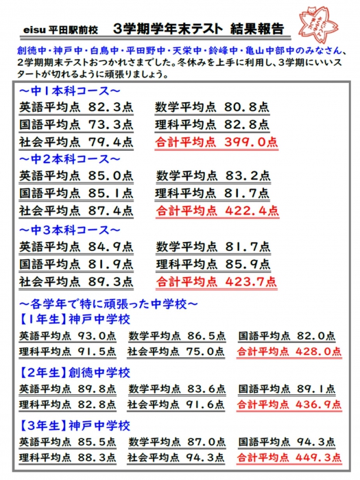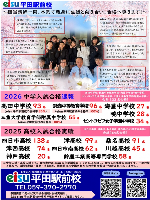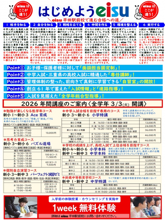 ※詳細に関しては、eisu平田駅前校 059-370-2770にお問合せください。