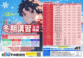 冬期講習の受付を開始いたしました!1・2学期で習ったことを整理したい方、次の学年に向けて準備したい方、たくさんの方の参加をお待ちしております。欠席された場合は、動画による振替、補講などを行いますので、お気軽にご参加ください!各コース、教室のキャパ・座席に限りがございますので、お早めにお申し込みください!特に小1・小2の低学年コース、中学受験コース(小4・小5)、高校受験コース(中3)は、すぐに満席になってしまうことがありますのでご注意ください!