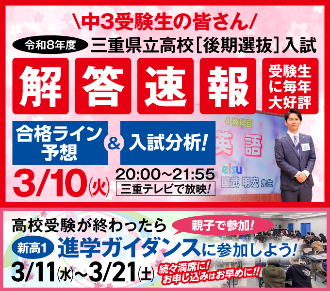 TV放送 3/10(火)20:00~21:55三重TV放送!「三重県立高校入試[後期選抜]解答速報」