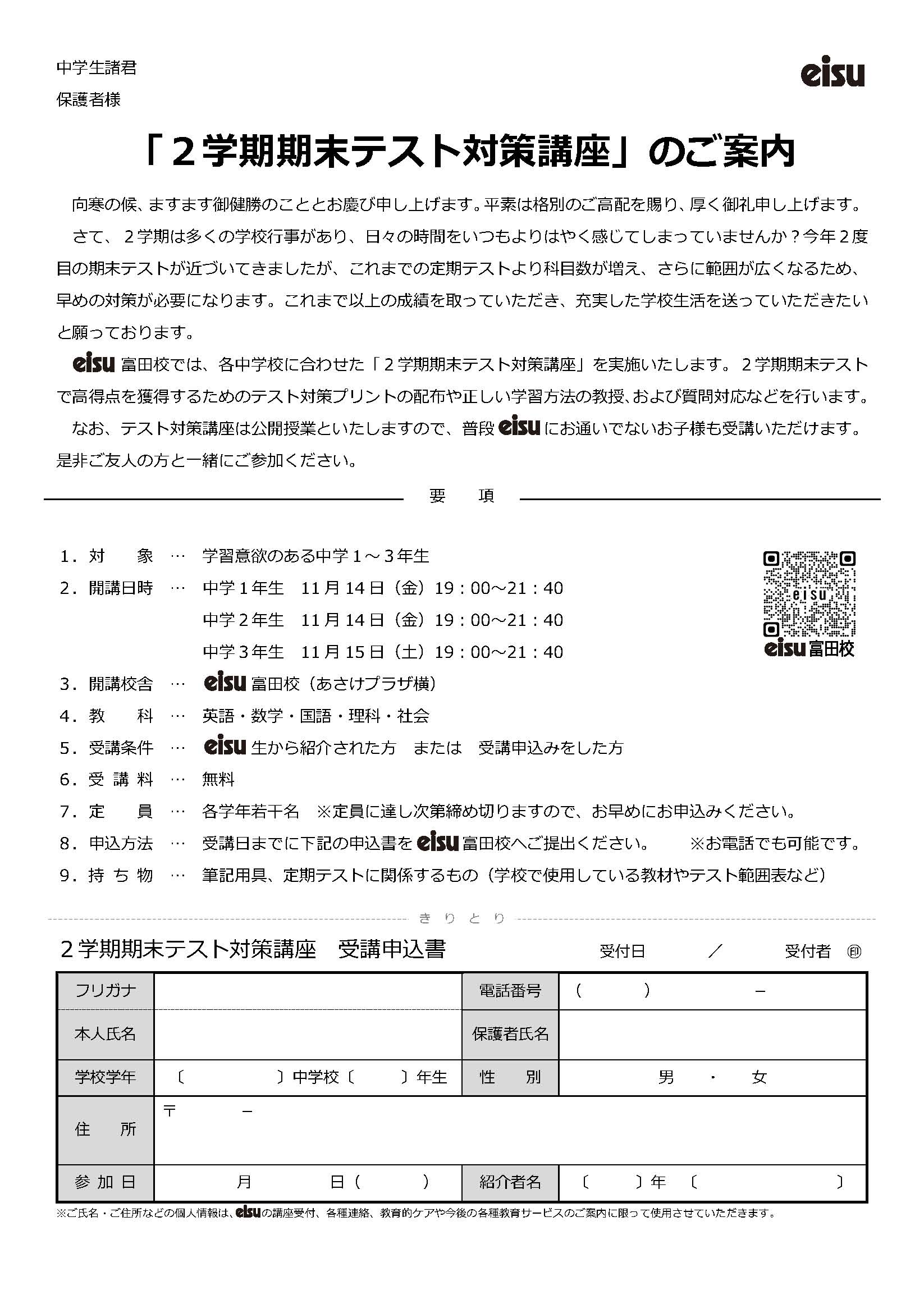 2025年度2学期期末テスト対策講座の案内です。