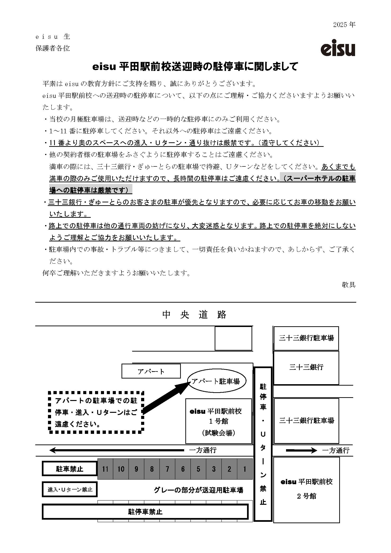 ⑥校舎前の月極駐車場内にeisu平田駅前校の駐車場がございますが、近隣の方や他社の駐車場もあるため、「eisu」と書かれていない駐車場には停めないでください。