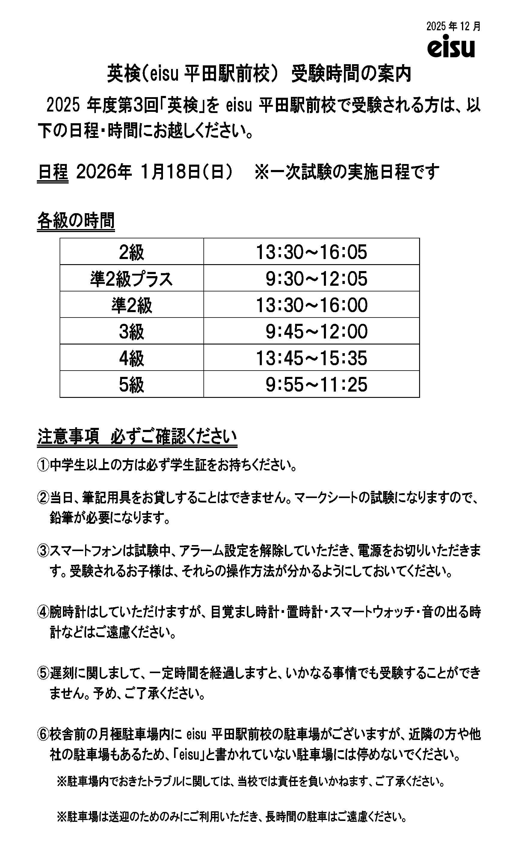 2025年度第3回「英検」をeisu平田駅前校で受験される方は、以下の日程・時間にお越しください。