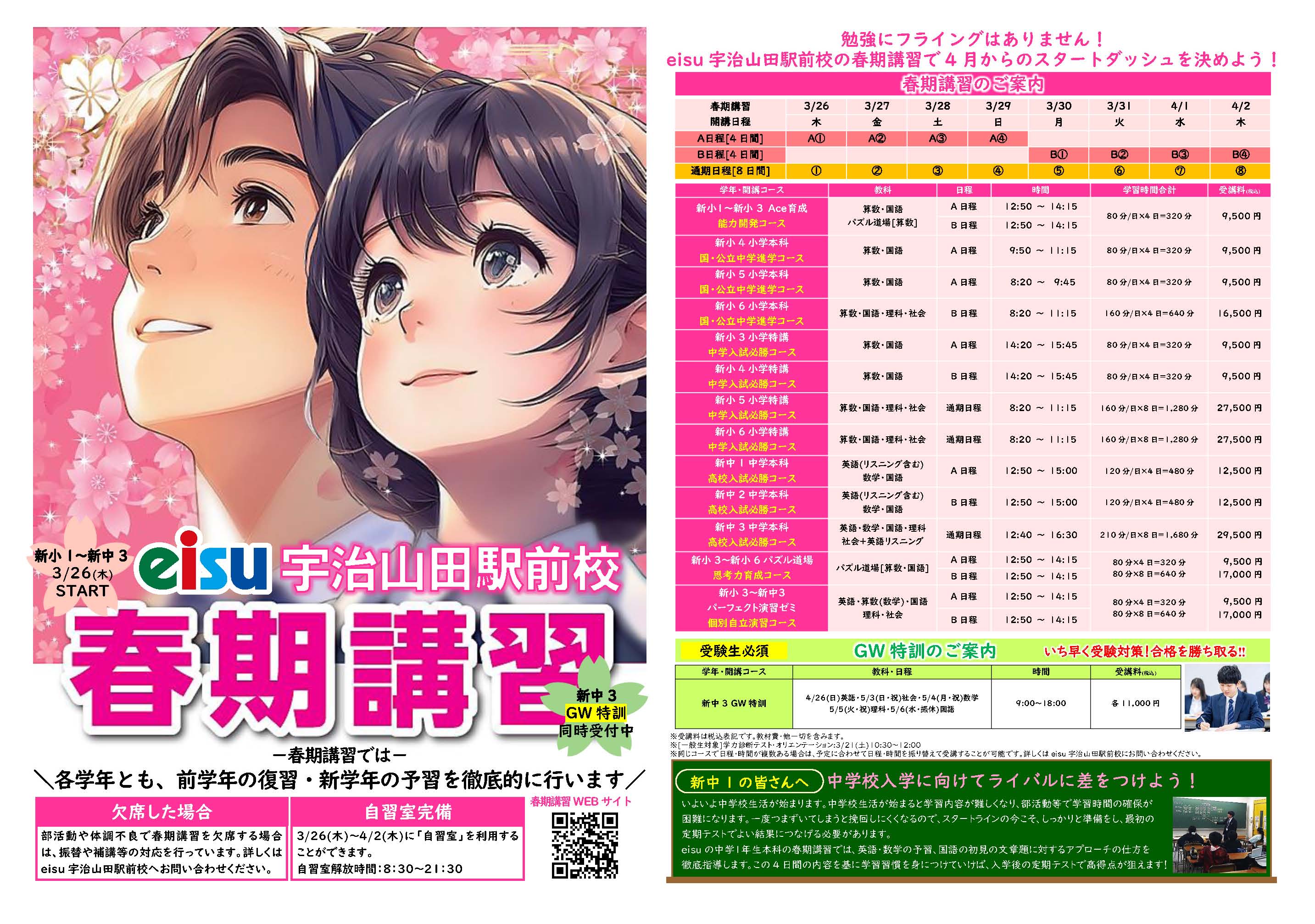 2026年度春期講習の申し込みを受け付けております。Webサイト上でお申込みいただくか、eisu宇治山田駅前校へ直接お電話ください。